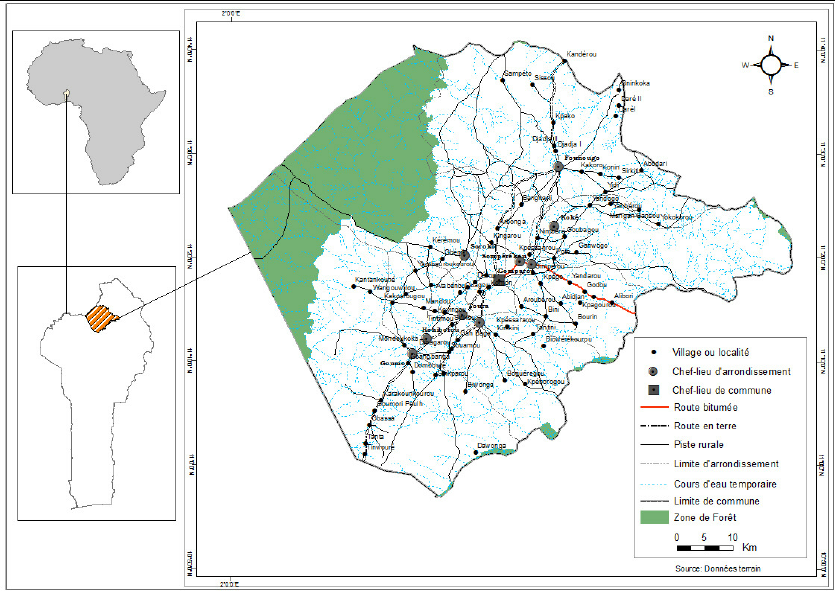 La commune de Kandi est localisée au cœur du département de l’Alibori entre 10° 54’ 00’’ et 11° 39’ 00’’ de latitude nord et entre 2° 36’ 45’’ et 3°15’45’’de longitude est. Elle est limitée au nord par les communes de Malanville et Karimama, au sud par la commune de Gogounou, à l’est par la commune de Ségbana et à l’ouest par la commune de Banikoara. Elle est dans la zone agro-écologique du bassin cotonnier et s’étend sur une superficie de 3421 km², soit environ 13 % du département de l’Alibori. Le territoire communal abrite 821 km² d’aires protégées qui réduisent sa superficie nette à aménager à 2600 km². Chef-lieu du département de l’Alibori, Kandi abrite la préfecture et plusieurs services déconcentrés de l’Etat. D’après le RGPH4, la commune de Kandi compte 82 villages administratifs dont 15 quartiers de ville répartis dans 10 arrondissements dont trois urbains (Kandi I, II et III) et sept ruraux (Angaradébou, Bensékou, Donwari, Kassakou, Saah, Sam et Sonsoro). La commune de Kandi est dirigée par un Conseil Communal de 29 membres (dont 01 femme) qui est l’organe délibérant et ayant à sa tête un Maire (organe exécutif). Dénombrée à une population de 167 283 habitants au RGPH4 de 2013, la commune de Kandi est peuplée par de nombreux groupes socioculturels ou groupes ethniques à savoir : les Peulh (35,20%), les Baatombou (27,10 %), les Mokollés et Yoruba (18,10%), les Dendi (11,90%) les Fons (1,6 %), les Adja (0,3 %), les Gua ou Otamari (0,4 %), les Yowa et Lokpa (0,3 %), les autres groupes socioculturels (2%) et les groupes socioculturels des autres nationalités étrangères (2,3%).